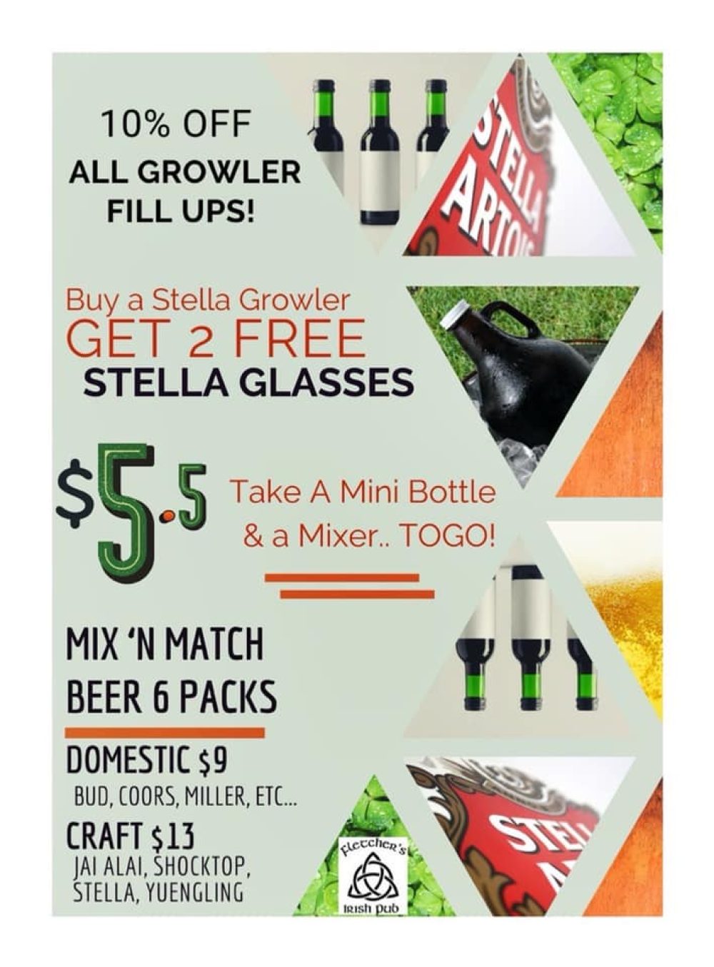 $30 – Five ready to cook burgers/buns (includes:Lettuce, Tomato, Onion, Kettle Chips, & Pickle Spears) Growlers Available – 10% off fillup of over 50 Taps Mix Drinks TOGO – $5.50 Domestic 6 Pack – $9 and Craft 6 Pack – $13